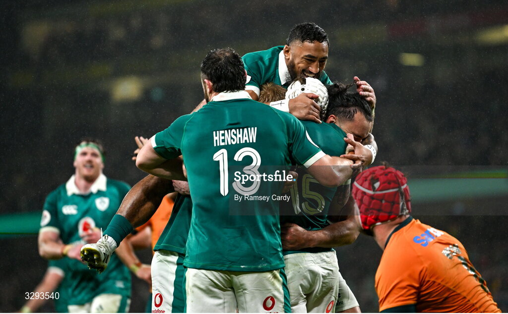 15 November 2025; Mack Hansen, white scrum cap, of Ireland is congratulated by team-mates, including Robbie Henshaw, 13, Bundee Aki, top and James Lowe after scoring his, and his side's, third try during the Quilter Nations Series 2025 match between Ireland and Australia at the Aviva Stadium in Dublin. Photo by Ramsey Cardy/Sportsfile