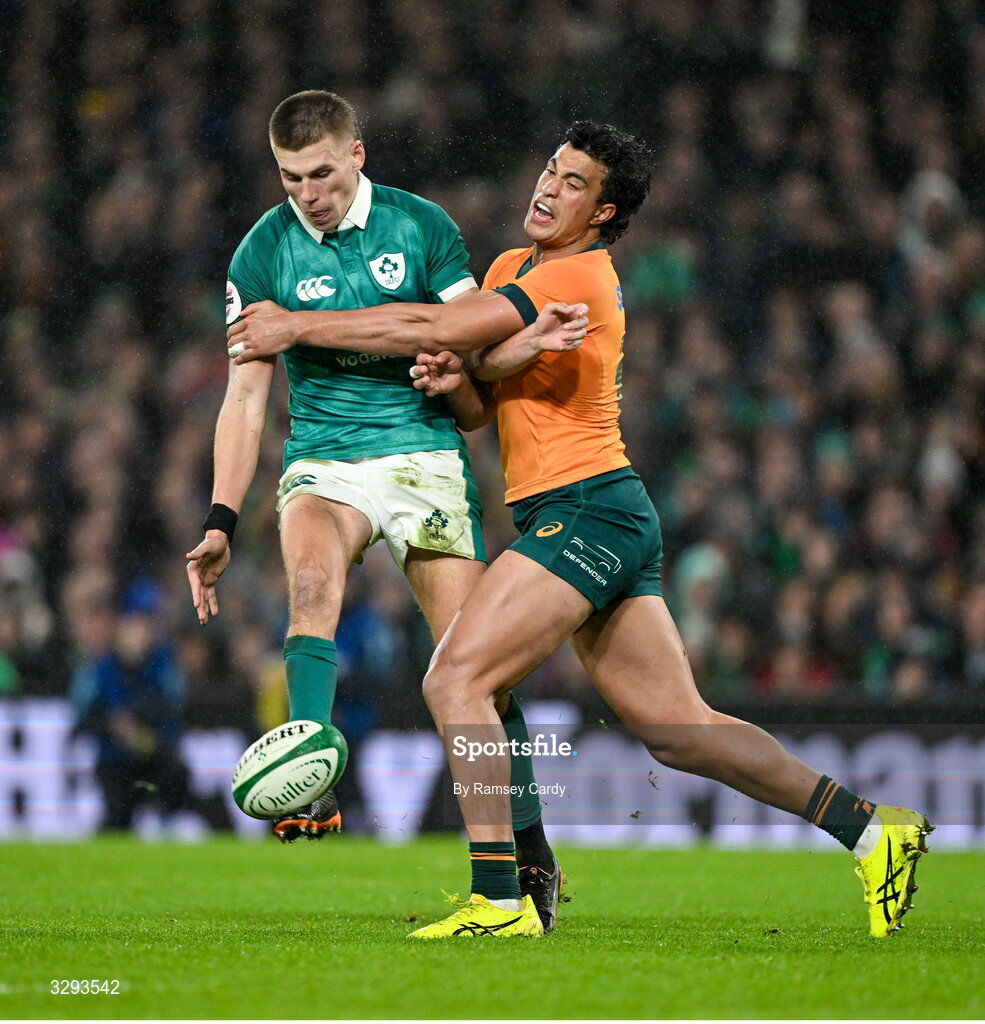 15 November 2025; Sam Prendergast of Ireland is tackled by Joseph-Aukuso Suaalii of Australia during the Quilter Nations Series 2025 match between Ireland and Australia at the Aviva Stadium in Dublin. Photo by Ramsey Cardy/Sportsfile