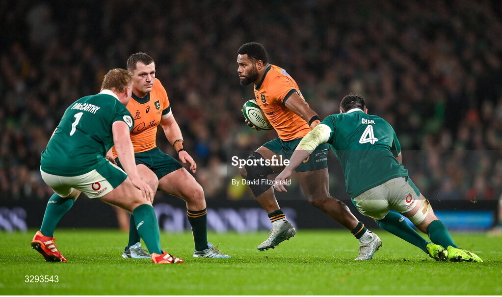 15 November 2025; Filipo Daugunu of Australia is tackled by James Ryan of Ireland during the Quilter Nations Series 2025 match between Ireland and Australia at the Aviva Stadium in Dublin. Photo by David Fitzgerald/Sportsfile