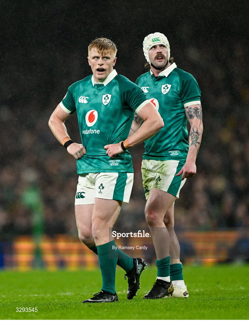 15 November 2025; Tommy O’Brien, left, and Mack Hansen of Ireland during the Quilter Nations Series 2025 match between Ireland and Australia at the Aviva Stadium in Dublin. Photo by Ramsey Cardy/Sportsfile