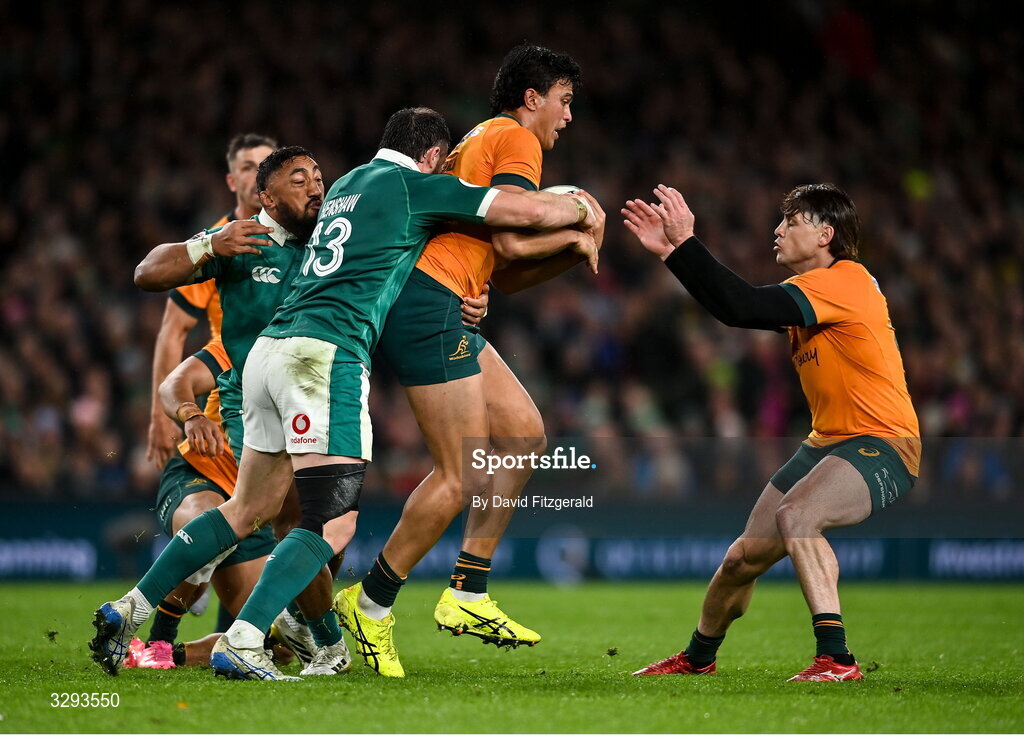 15 November 2025; Joseph-Aukuso Suaalii of Australia with the support of team-mate James O’Connor, right, is tackled by Robbie Henshaw of Ireland during the Quilter Nations Series 2025 match between Ireland and Australia at the Aviva Stadium in Dublin. Photo by David Fitzgerald/Sportsfile