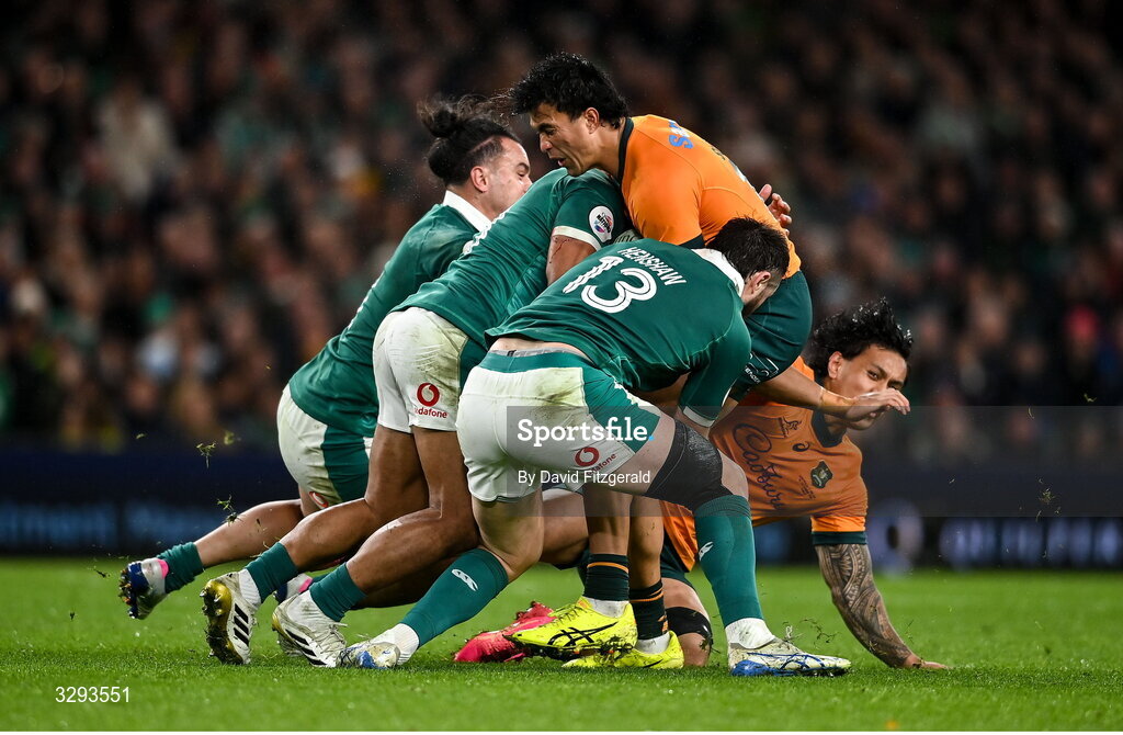15 November 2025; Joseph-Aukuso Suaalii of Australia is tackled by Ireland players Robbie Henshaw, 13, Bundee Aki and James Lowe, left, during the Quilter Nations Series 2025 match between Ireland and Australia at the Aviva Stadium in Dublin. Photo by David Fitzgerald/Sportsfile