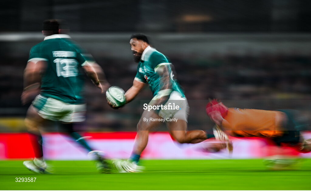15 November 2025; Bundee Aki of Ireland offloads to teammate Robbie Henshaw, left, despite the tackle of Harry Wilson of Australia during the Quilter Nations Series 2025 match between Ireland and Australia at the Aviva Stadium in Dublin. Photo by Ramsey Cardy/Sportsfile