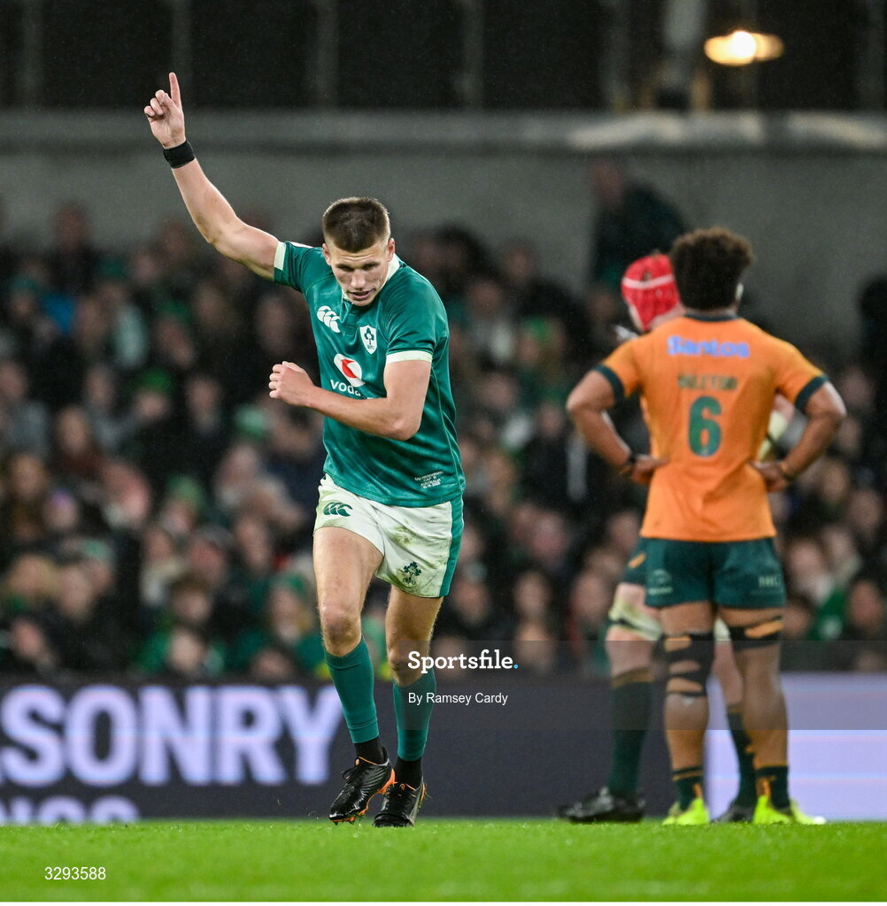 15 November 2025; Sam Prendergast of Ireland celebrates after kicking a drop goal during the Quilter Nations Series 2025 match between Ireland and Australia at the Aviva Stadium in Dublin. Photo by Ramsey Cardy/Sportsfile