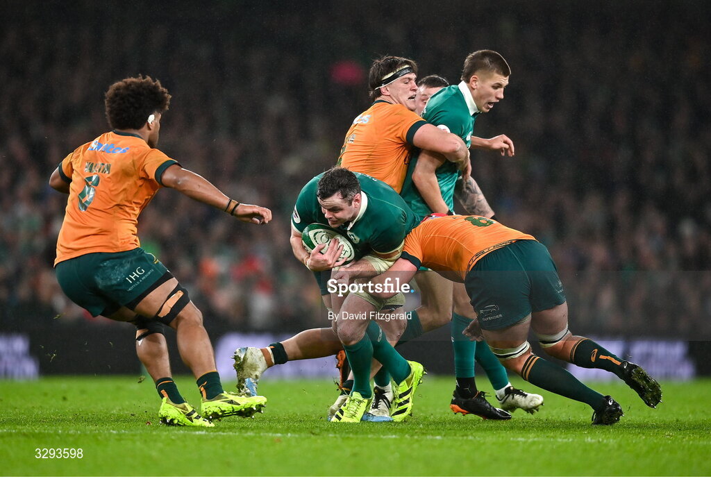 15 November 2025; James Ryan of Ireland is tackled by Harry Wilson of Australia during the Quilter Nations Series 2025 match between Ireland and Australia at the Aviva Stadium in Dublin. Photo by David Fitzgerald/Sportsfile