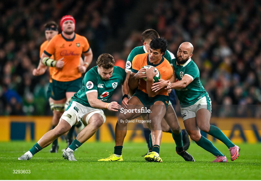 15 November 2025; Joseph-Aukuso Suaalii of Australia is tackled by Ireland players, from left, Cian Prendergast, Sam Prendergast and Jamison Gibson-Park during the Quilter Nations Series 2025 match between Ireland and Australia at the Aviva Stadium in Dublin. Photo by David Fitzgerald/Sportsfile