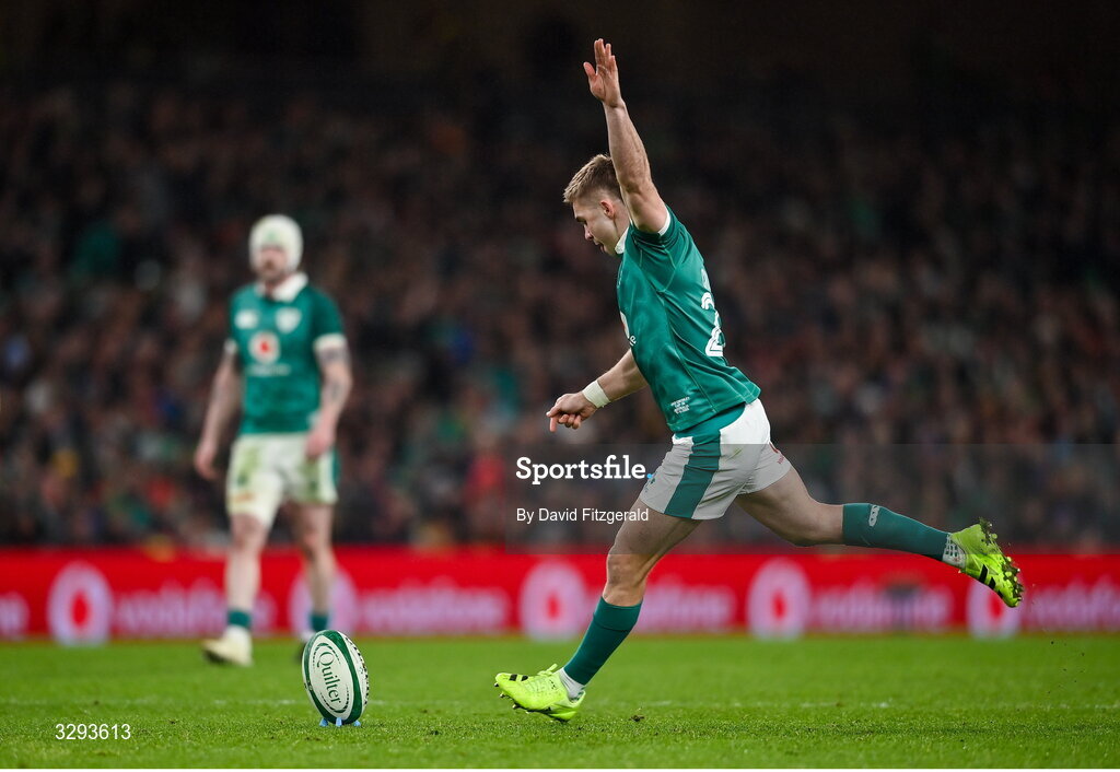 15 November 2025; Jack Crowley of Ireland kicks a penalty during the Quilter Nations Series 2025 match between Ireland and Australia at the Aviva Stadium in Dublin. Photo by David Fitzgerald/Sportsfile