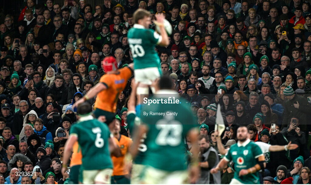 15 November 2025; Supporters watch on during the Quilter Nations Series 2025 match between Ireland and Australia at the Aviva Stadium in Dublin. Photo by Ramsey Cardy/Sportsfile