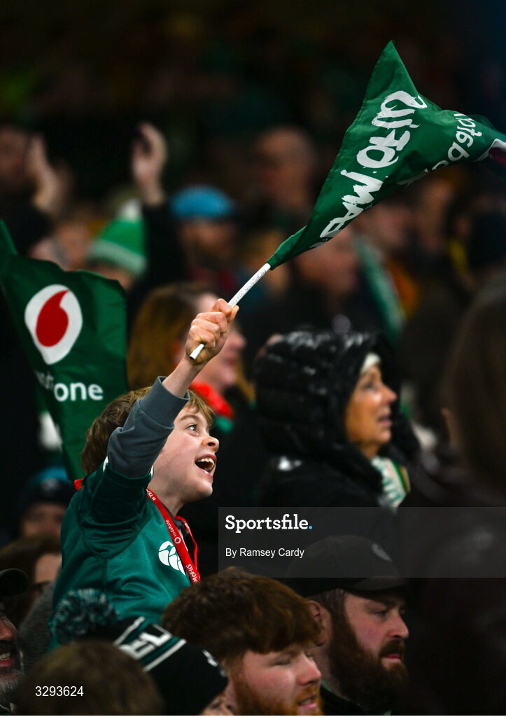15 November 2025; An Ireland supporter celebrates during the Quilter Nations Series 2025 match between Ireland and Australia at the Aviva Stadium in Dublin. Photo by Ramsey Cardy/Sportsfile