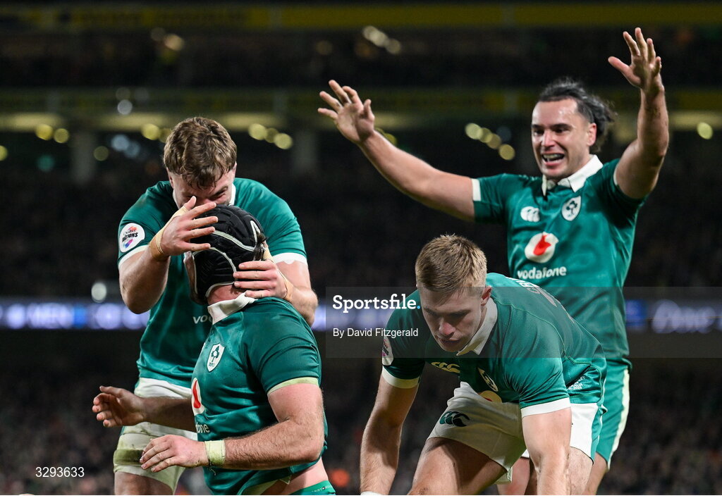 15 November 2025; Caelan Doris of Ireland is congratulated by team-mate Cian Prendergast after scoring their fourth try as James Lowe, right, celebrates during the Quilter Nations Series 2025 match between Ireland and Australia at the Aviva Stadium in Dublin. Photo by David Fitzgerald/Sportsfile