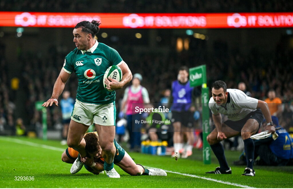 15 November 2025; James Lowe of Ireland is tackled by Andrew Kellaway of Australia during the Quilter Nations Series 2025 match between Ireland and Australia at the Aviva Stadium in Dublin. Photo by David Fitzgerald/Sportsfile