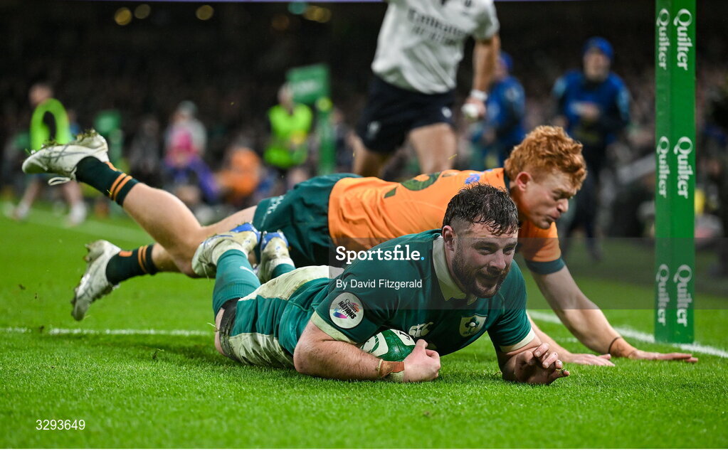 15 November 2025; Robbie Henshaw of Ireland scores his side's sixth try during the Quilter Nations Series 2025 match between Ireland and Australia at the Aviva Stadium in Dublin. Photo by David Fitzgerald/Sportsfile