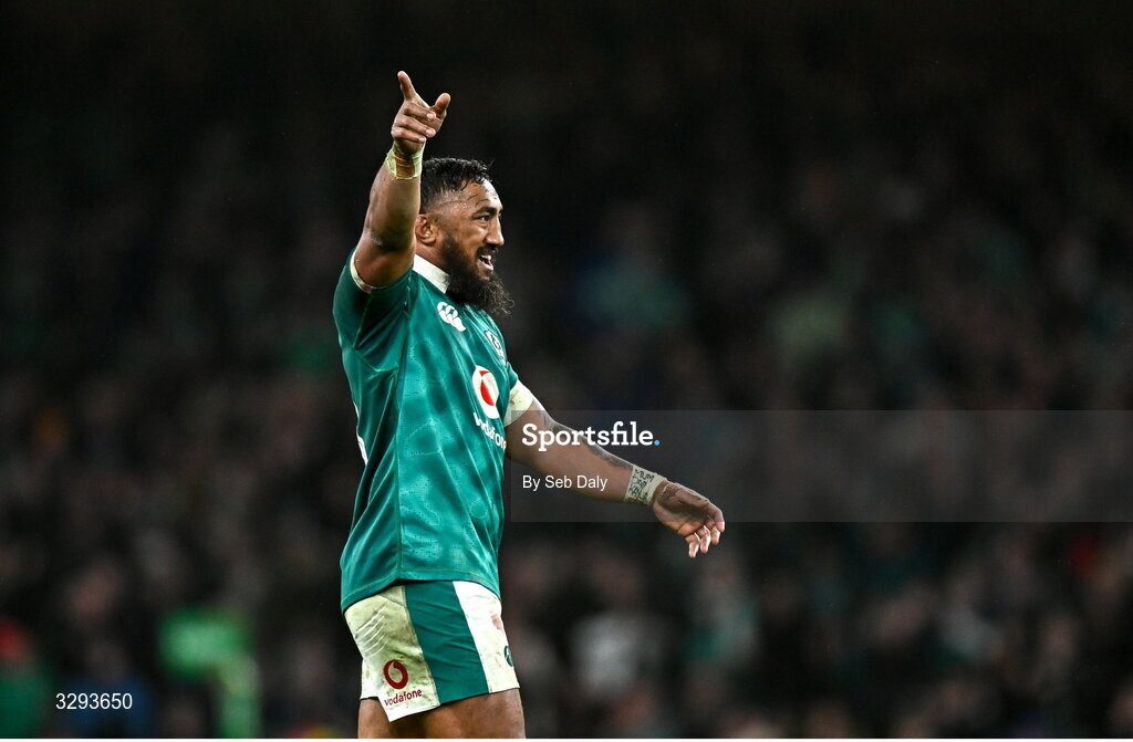 15 November 2025; Bundee Aki of Ireland celebrates after the Quilter Nations Series 2025 match between Ireland and Australia at the Aviva Stadium in Dublin. Photo by Seb Daly/Sportsfile
