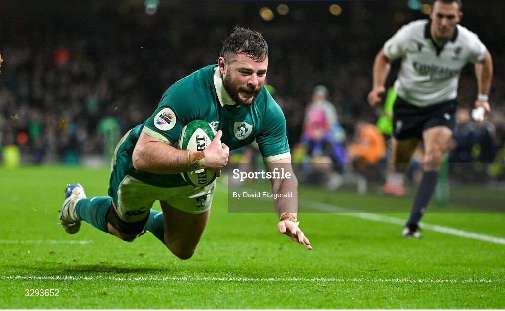 15 November 2025; Robbie Henshaw of Ireland scores his side's sixth try during the Quilter Nations Series 2025 match between Ireland and Australia at the Aviva Stadium in Dublin. Photo by David Fitzgerald/Sportsfile