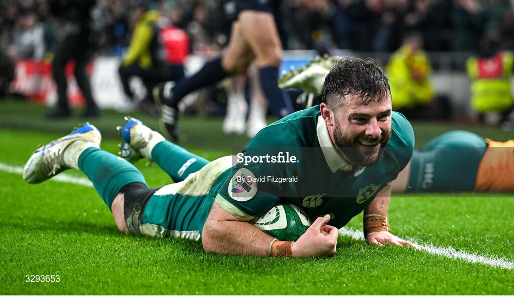 15 November 2025; Robbie Henshaw of Ireland celebrates after scoring his side's sixth try during the Quilter Nations Series 2025 match between Ireland and Australia at the Aviva Stadium in Dublin. Photo by David Fitzgerald/Sportsfile