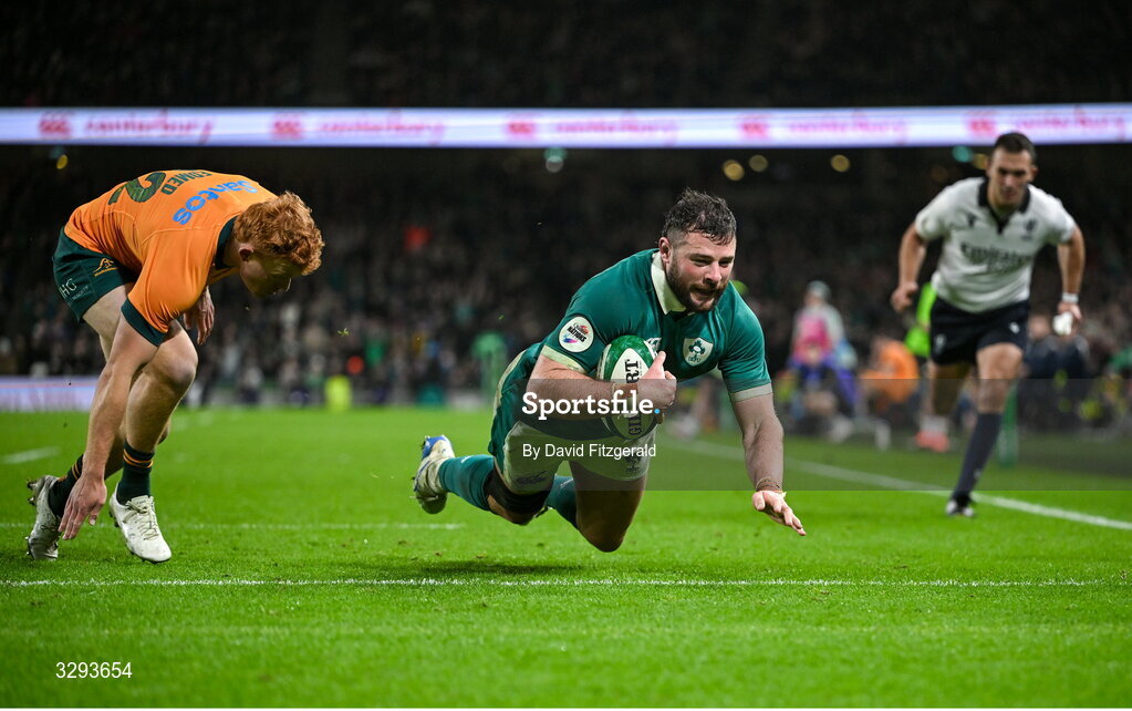 15 November 2025; Robbie Henshaw of Ireland scores his side's sixth try during the Quilter Nations Series 2025 match between Ireland and Australia at the Aviva Stadium in Dublin. Photo by David Fitzgerald/Sportsfile