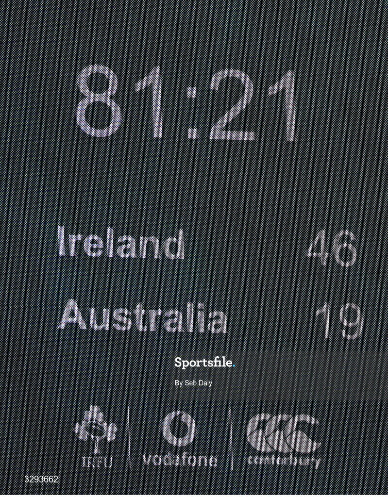 15 November 2025; A general view of the scoreboard after the Quilter Nations Series 2025 match between Ireland and Australia at the Aviva Stadium in Dublin. Photo by Seb Daly/Sportsfile