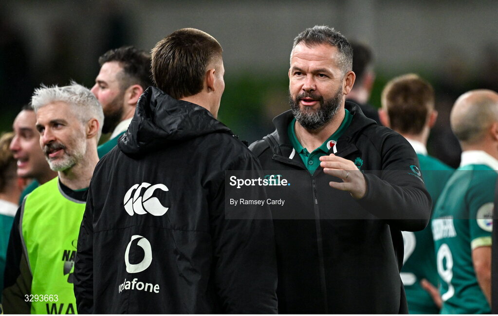 15 November 2025; Ireland head coach Andy Farrell celebrates with Sam Prendergast of Ireland after the Quilter Nations Series 2025 match between Ireland and Australia at the Aviva Stadium in Dublin. Photo by Ramsey Cardy/Sportsfile