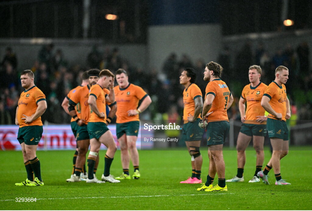 15 November 2025; Australia players after their defeat in the Quilter Nations Series 2025 match between Ireland and Australia at the Aviva Stadium in Dublin. Photo by Ramsey Cardy/Sportsfile