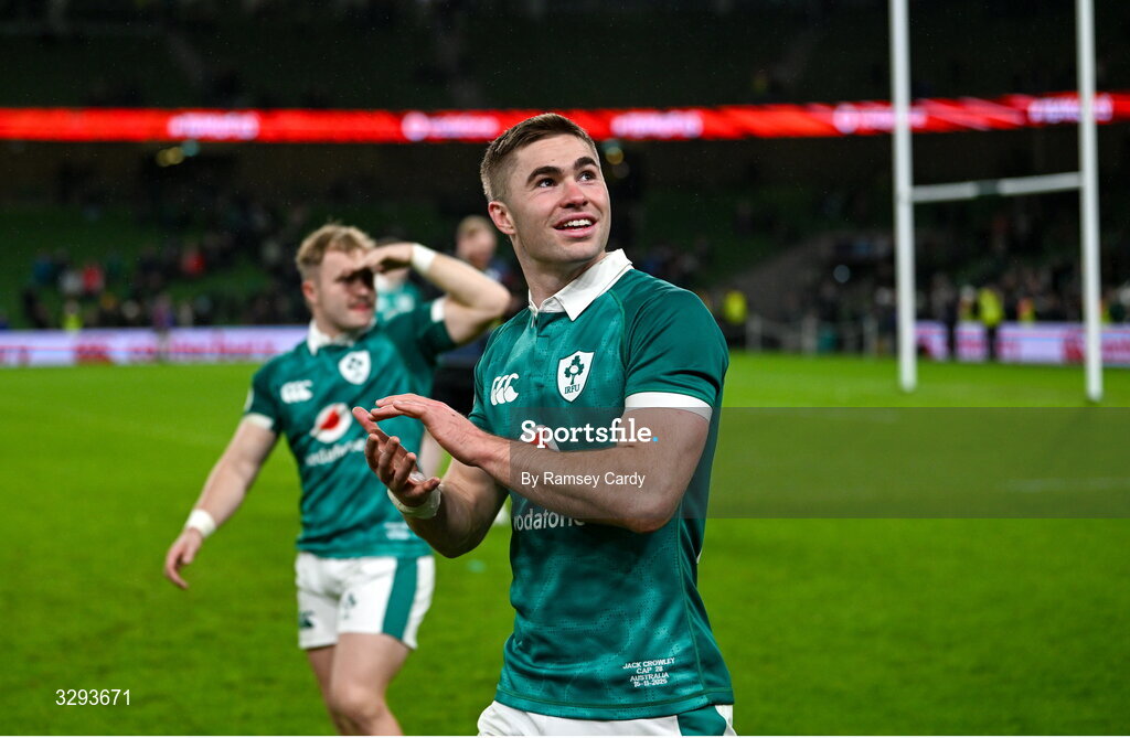 15 November 2025; Jack Crowley of Ireland after the Quilter Nations Series 2025 match between Ireland and Australia at the Aviva Stadium in Dublin. Photo by Ramsey Cardy/Sportsfile
