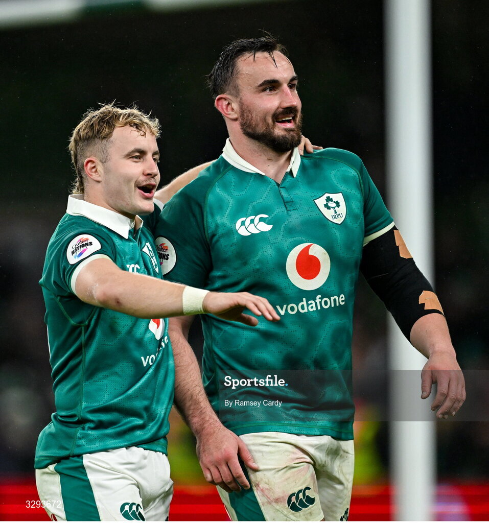15 November 2025; Craig Casey, left, and Rónan Kelleher of Ireland before the Quilter Nations Series 2025 match between Ireland and Australia at the Aviva Stadium in Dublin. Photo by Ramsey Cardy/Sportsfile