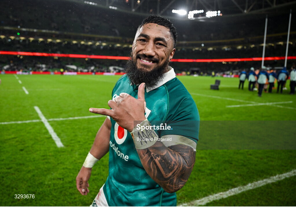 15 November 2025; Bundee Aki of Ireland celebrates after the Quilter Nations Series 2025 match between Ireland and Australia at the Aviva Stadium in Dublin. Photo by David Fitzgerald/Sportsfile
