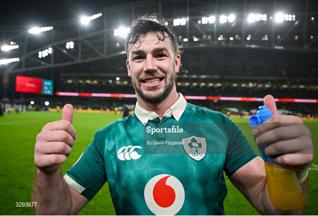 15 November 2025; Caelan Doris of Ireland celebrates after the Quilter Nations Series 2025 match between Ireland and Australia at the Aviva Stadium in Dublin. Photo by David Fitzgerald/Sportsfile