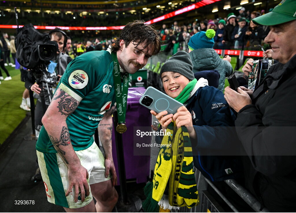 15 November 2025; Mack Hansen of Ireland with supporters after the Quilter Nations Series 2025 match between Ireland and Australia at the Aviva Stadium in Dublin. Photo by David Fitzgerald/Sportsfile