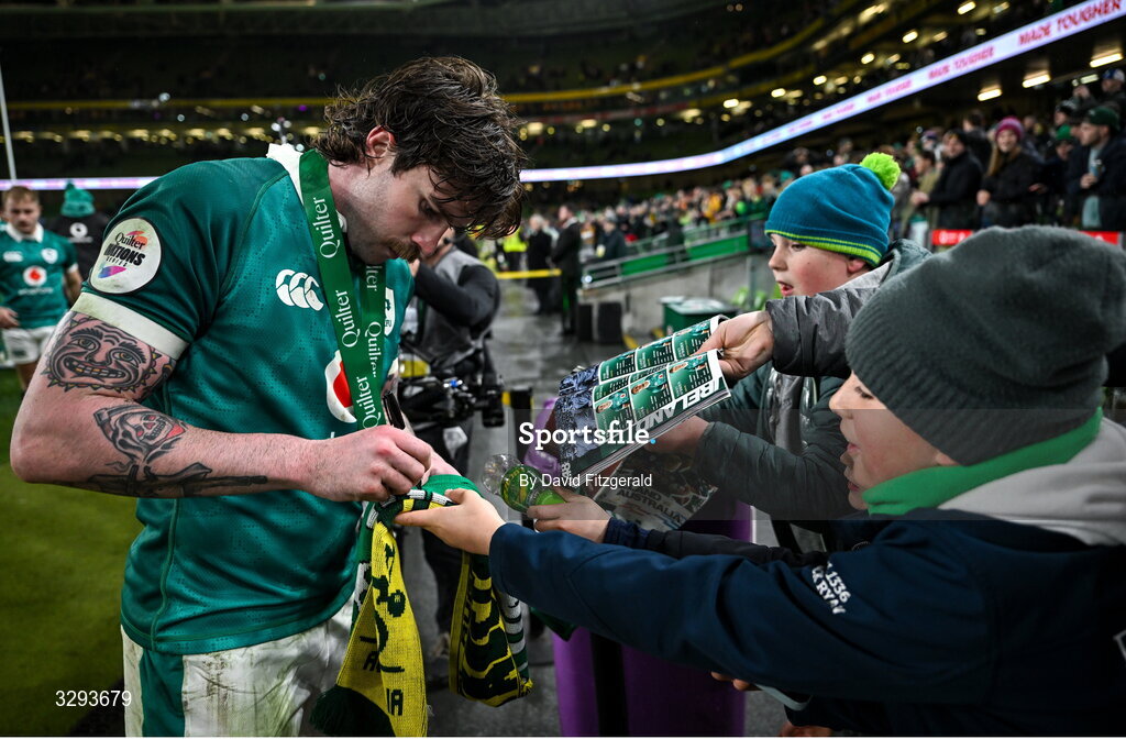 15 November 2025; Mack Hansen of Ireland with supporters after the Quilter Nations Series 2025 match between Ireland and Australia at the Aviva Stadium in Dublin. Photo by David Fitzgerald/Sportsfile