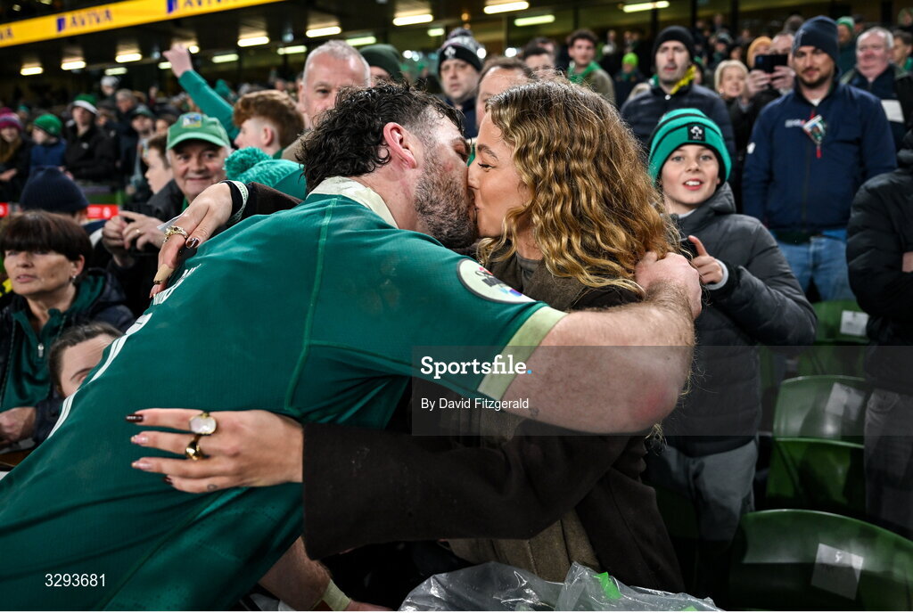 15 November 2025; Caelan Doris of Ireland with partner Maeve McGann after the Quilter Nations Series 2025 match between Ireland and Australia at the Aviva Stadium in Dublin. Photo by David Fitzgerald/Sportsfile