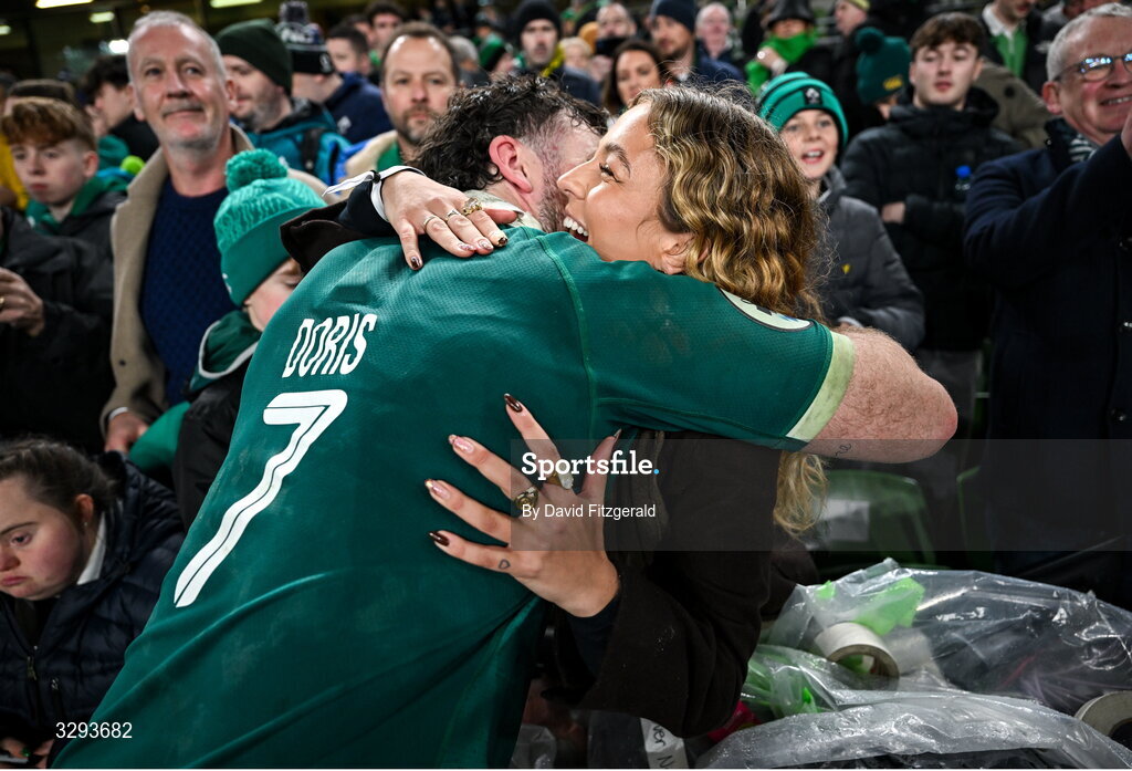 15 November 2025; Caelan Doris of Ireland with partner Maeve McGann after the Quilter Nations Series 2025 match between Ireland and Australia at the Aviva Stadium in Dublin. Photo by David Fitzgerald/Sportsfile