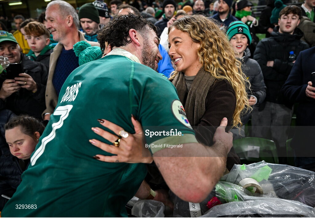 15 November 2025; Caelan Doris of Ireland with partner Maeve McGann after the Quilter Nations Series 2025 match between Ireland and Australia at the Aviva Stadium in Dublin. Photo by David Fitzgerald/Sportsfile