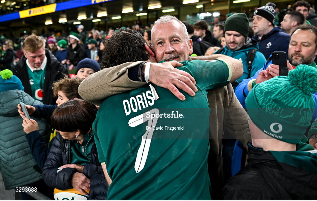 15 November 2025; Caelan Doris of Ireland celebrates with his father Chris after the Quilter Nations Series 2025 match between Ireland and Australia at the Aviva Stadium in Dublin. Photo by David Fitzgerald/Sportsfile