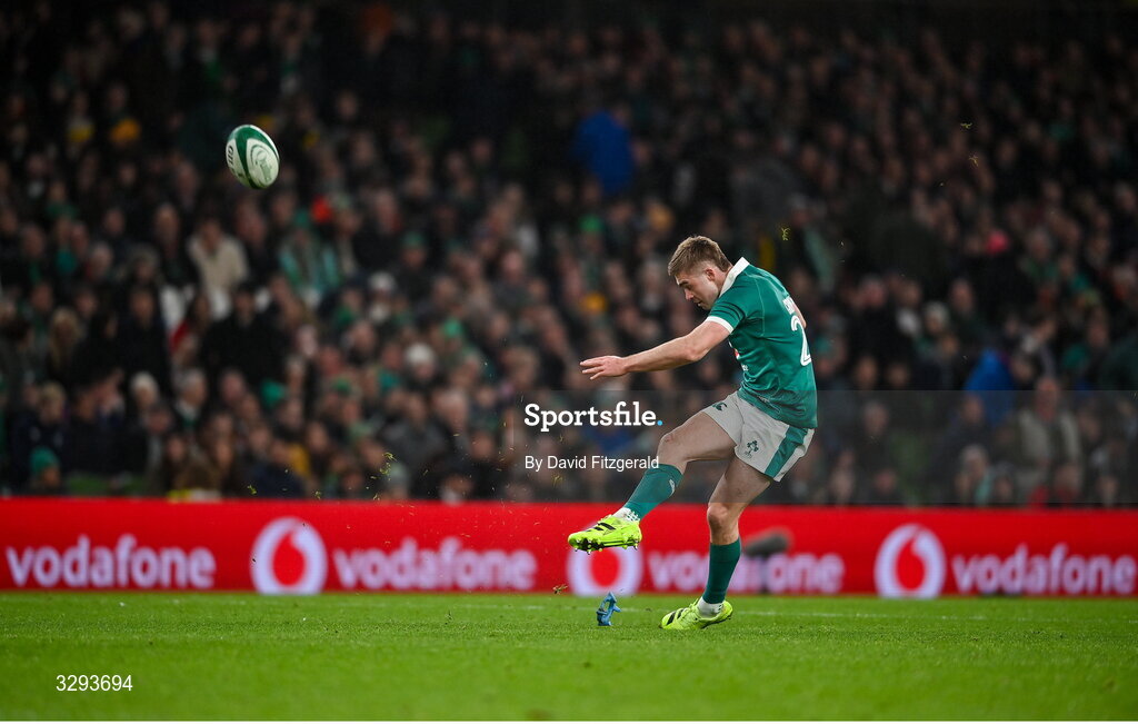 15 November 2025; Jack Crowley of Ireland kicks a conversion during the Quilter Nations Series 2025 match between Ireland and Australia at the Aviva Stadium in Dublin. Photo by David Fitzgerald/Sportsfile