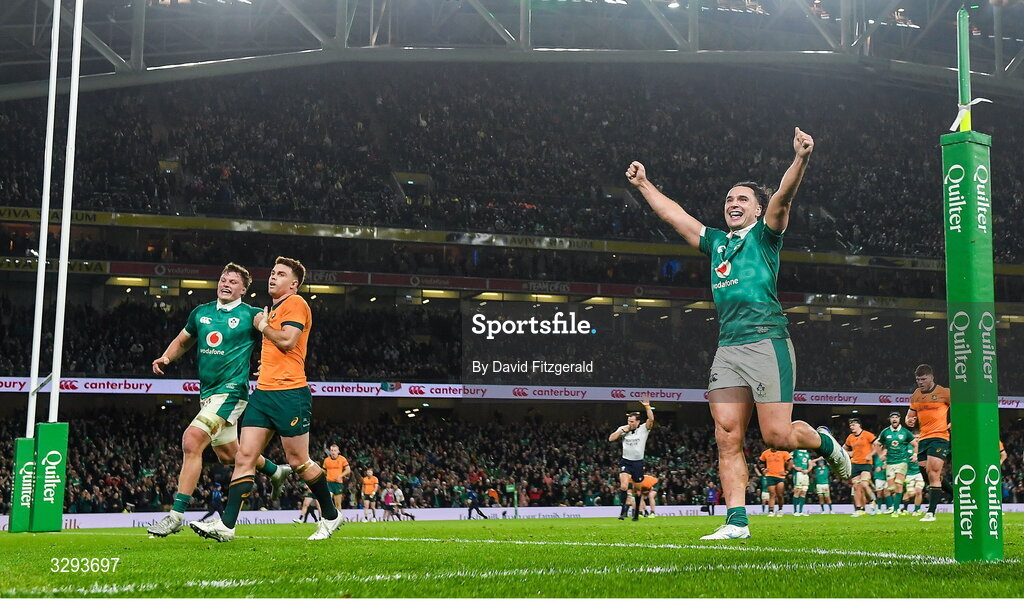 15 November 2025; James Lowe of Ireland celebrates after team-mate Robbie Henshaw, not pictured, scored their sixth and final try of the Quilter Nations Series 2025 match between Ireland and Australia at the Aviva Stadium in Dublin. Photo by David Fitzgerald/Sportsfile