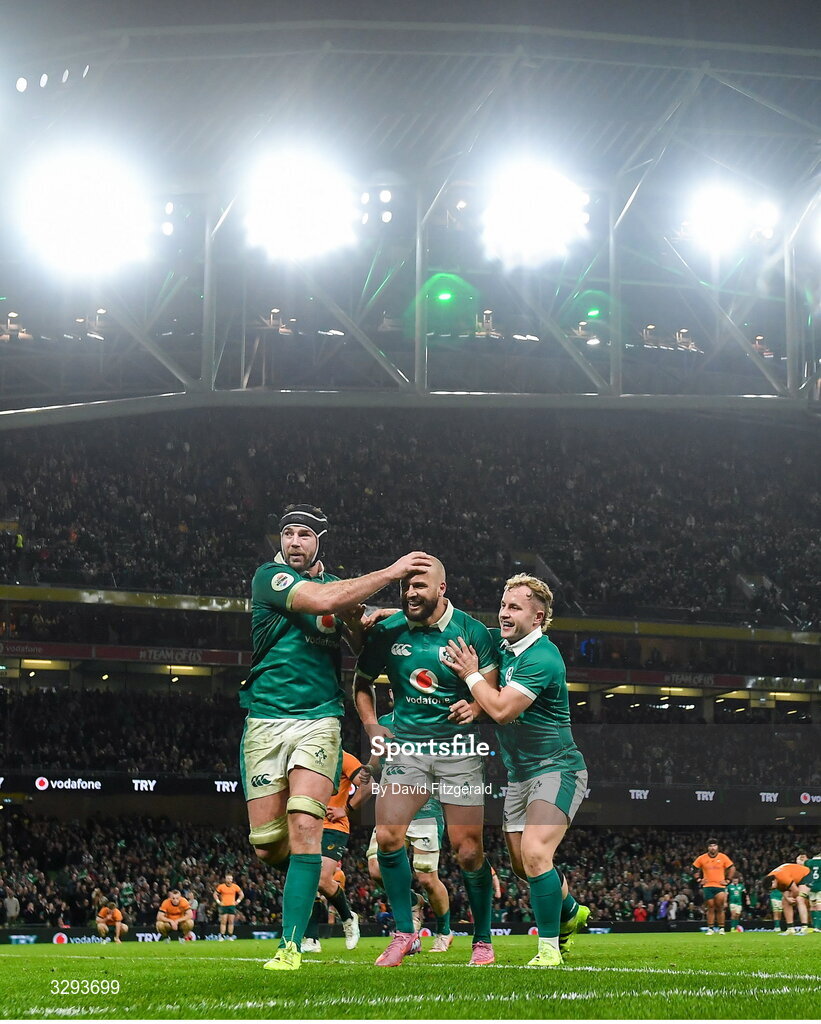 15 November 2025; Ireland players, from left, Caelan Doris, Jamison Gibson-Park and Craig Casey celebrate their side's sixth try, scored by Robbie Henshaw, not pictured, the Quilter Nations Series 2025 match between Ireland and Australia at the Aviva Stadium in Dublin. Photo by David Fitzgerald/Sportsfile
