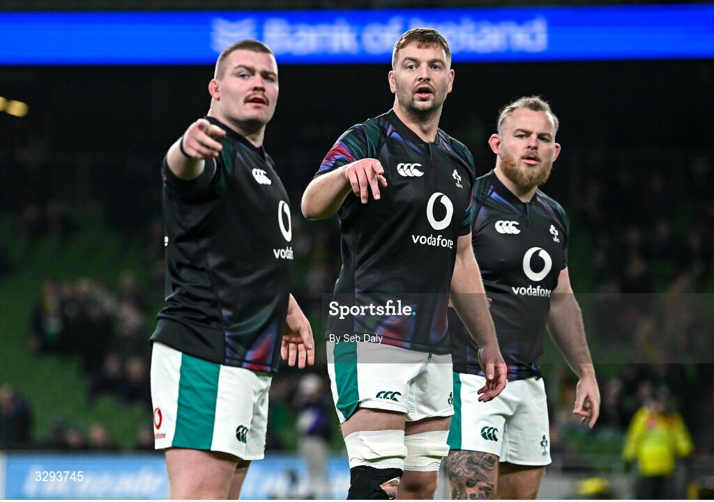 15 November 2025; Ireland players, from left, Jack Boyle, Iain Henderson and Finlay Bealham before the Quilter Nations Series 2025 match between Ireland and Australia at the Aviva Stadium in Dublin. Photo by Seb Daly/Sportsfile