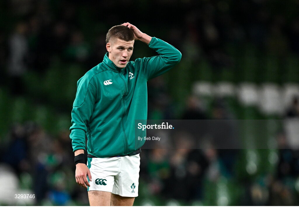 15 November 2025; Sam Prendergast of Ireland before the Quilter Nations Series 2025 match between Ireland and Australia at the Aviva Stadium in Dublin. Photo by Seb Daly/Sportsfile