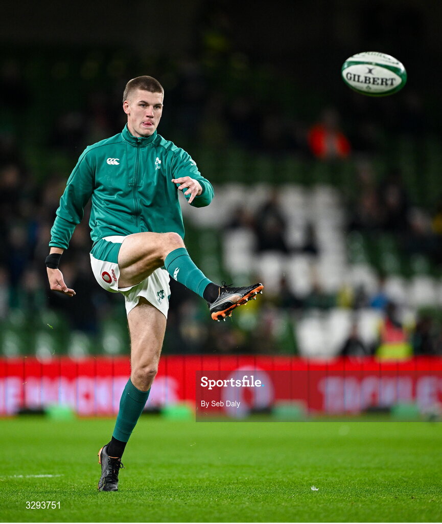 15 November 2025; Sam Prendergast of Ireland before the Quilter Nations Series 2025 match between Ireland and Australia at the Aviva Stadium in Dublin. Photo by Seb Daly/Sportsfile