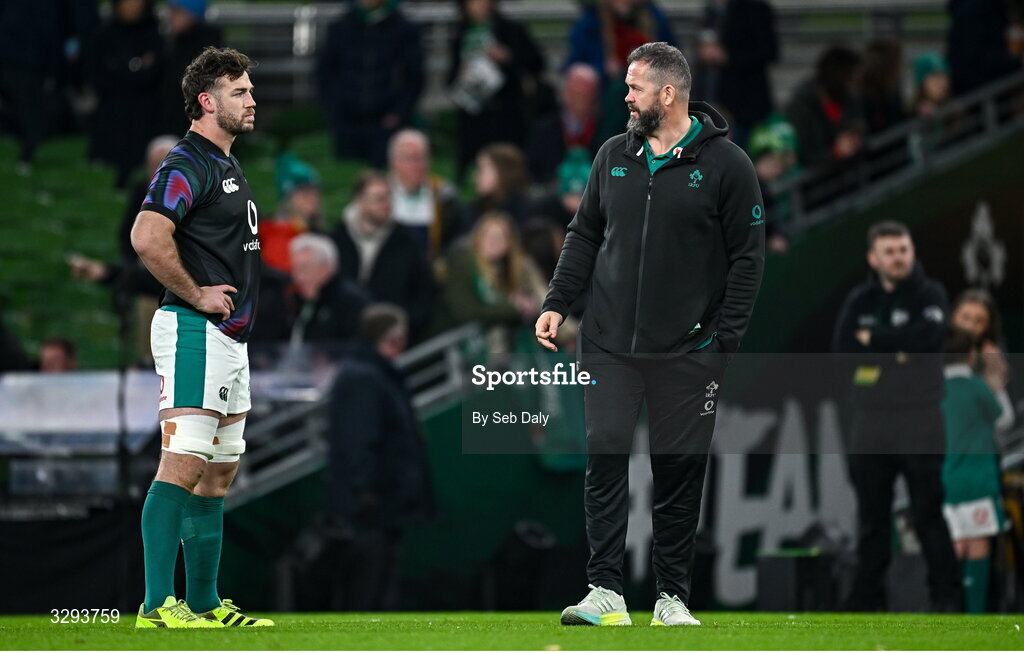 15 November 2025; Ireland captain Caelan Doris, left, and head coach Andy Farrell before Quilter Nations Series 2025 match between Ireland and Australia at the Aviva Stadium in Dublin. Photo by Seb Daly/Sportsfile