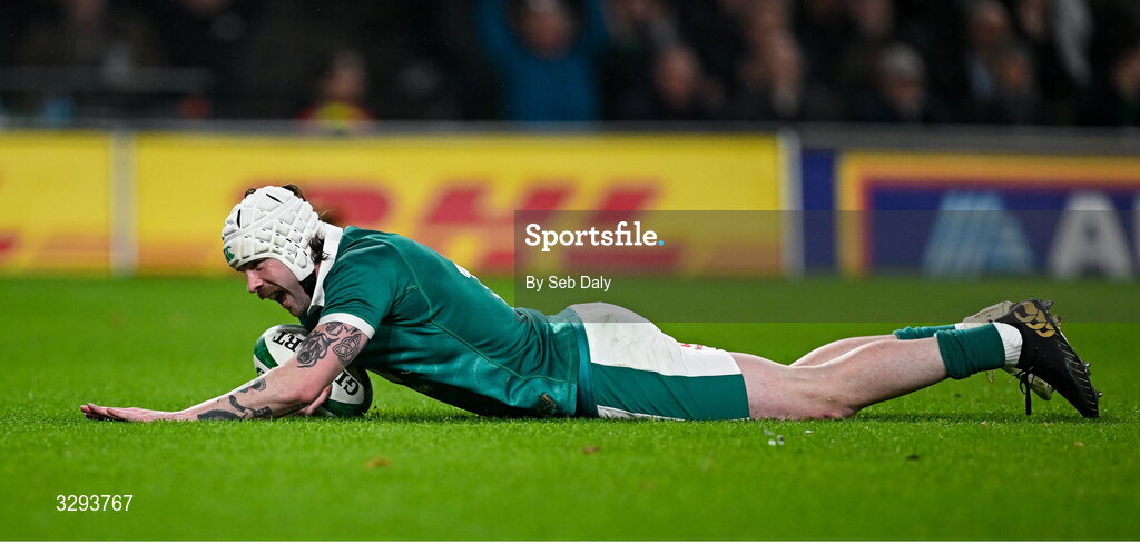 15 November 2025; Mack Hansen of Ireland scores his side's second try during the Quilter Nations Series 2025 match between Ireland and Australia at the Aviva Stadium in Dublin. Photo by Seb Daly/Sportsfile