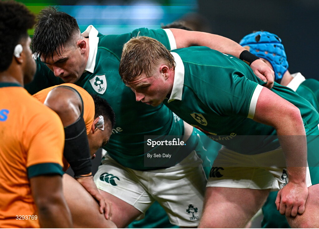 15 November 2025; Ireland players Dan Sheehan, left, and Paddy McCarthy during the Quilter Nations Series 2025 match between Ireland and Australia at the Aviva Stadium in Dublin. Photo by Seb Daly/Sportsfile