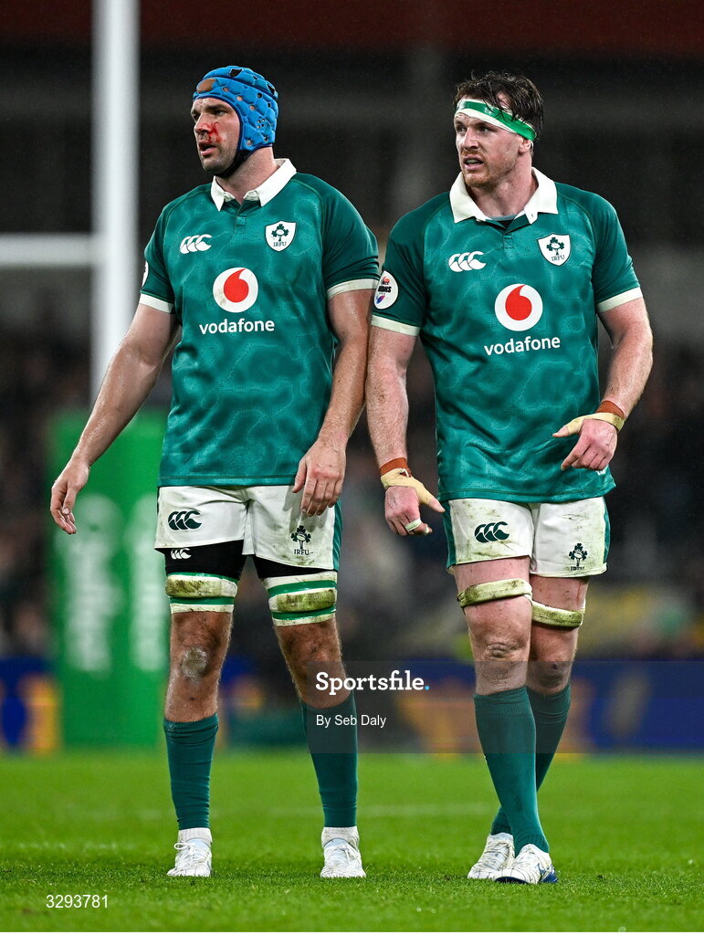 15 November 2025; Ireland players Tadhg Beirne, left, and Ryan Baird during the Quilter Nations Series 2025 match between Ireland and Australia at the Aviva Stadium in Dublin. Photo by Seb Daly/Sportsfile