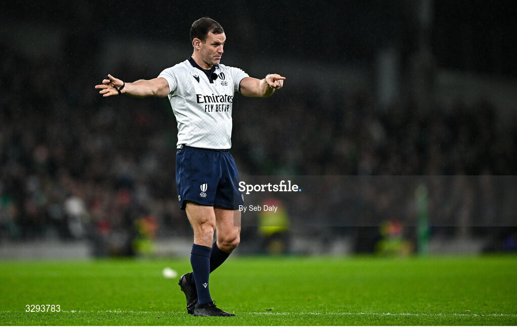 15 November 2025; Referee Karl Dickson during the Quilter Nations Series 2025 match between Ireland and Australia at the Aviva Stadium in Dublin. Photo by Seb Daly/Sportsfile