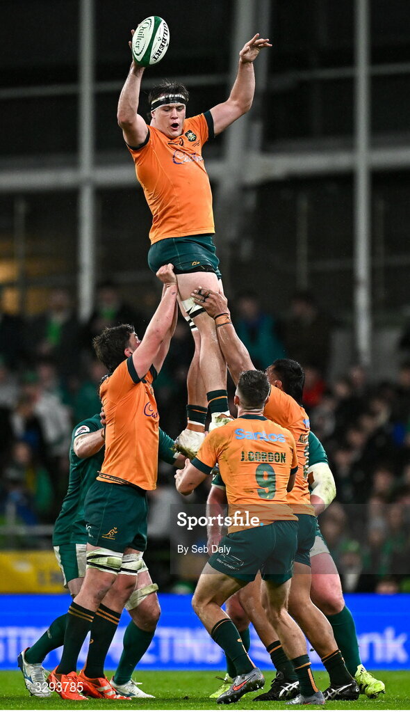 15 November 2025; Tom Hooper of Australia takes possession in a line-out during the Quilter Nations Series 2025 match between Ireland and Australia at the Aviva Stadium in Dublin. Photo by Seb Daly/Sportsfile