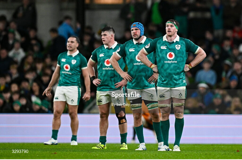 15 November 2025; Ireland players, from right, Ryan Baird, Tadhg Beirne, Dan Sheehan and James Lowe during the Quilter Nations Series 2025 match between Ireland and Australia at the Aviva Stadium in Dublin. Photo by Seb Daly/Sportsfile