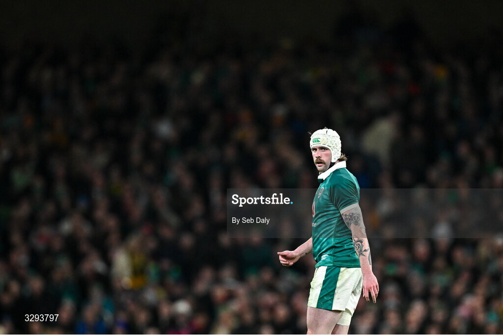 15 November 2025; Mack Hansen of Ireland during the Quilter Nations Series 2025 match between Ireland and Australia at the Aviva Stadium in Dublin. Photo by Seb Daly/Sportsfile