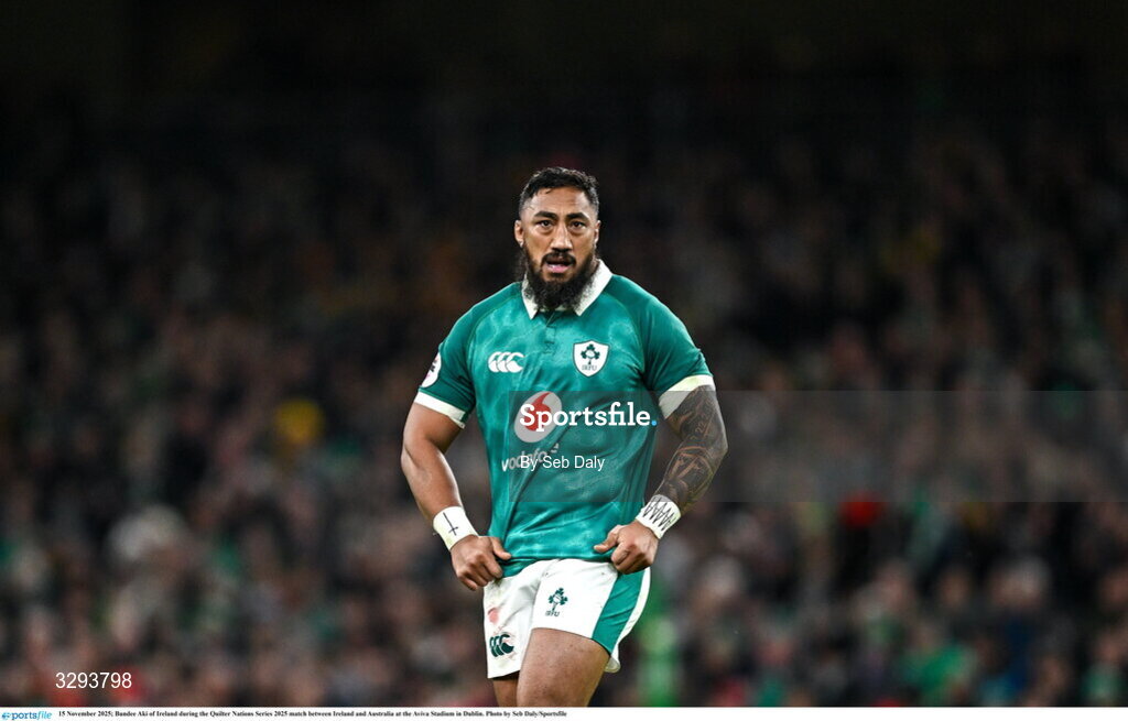 15 November 2025; Bundee Aki of Ireland during the Quilter Nations Series 2025 match between Ireland and Australia at the Aviva Stadium in Dublin. Photo by Seb Daly/Sportsfile