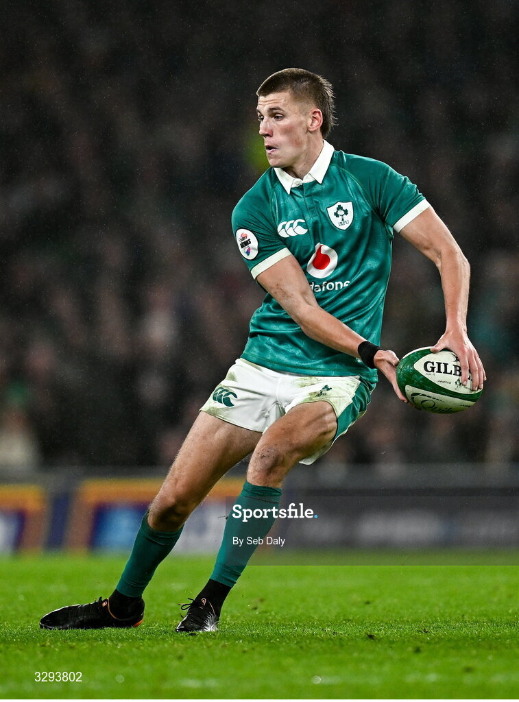 15 November 2025; Sam Prendergast of Ireland during the Quilter Nations Series 2025 match between Ireland and Australia at the Aviva Stadium in Dublin. Photo by Seb Daly/Sportsfile