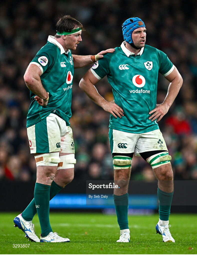 15 November 2025; Ireland players Ryan Baird, left, and Tadhg Beirne during the Quilter Nations Series 2025 match between Ireland and Australia at the Aviva Stadium in Dublin. Photo by Seb Daly/Sportsfile